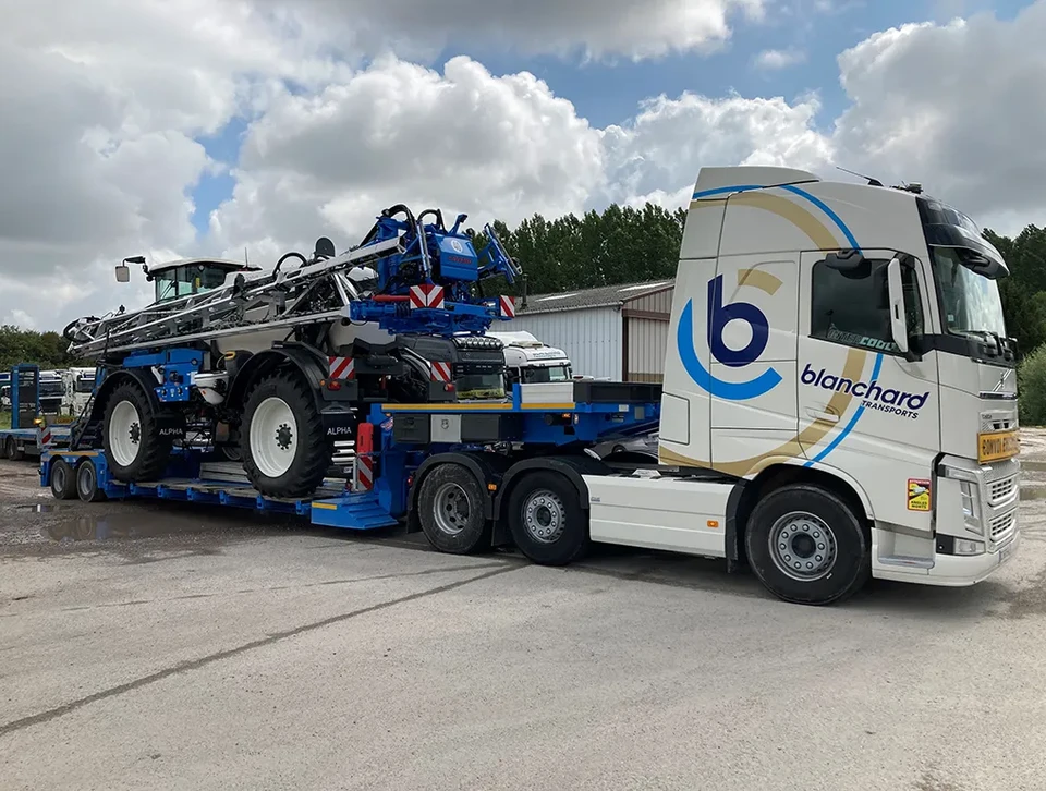 Transport spécialisé de tracteurs, moissonneuses et engins spécifiques avec dispositifs parfaitement appropriés.